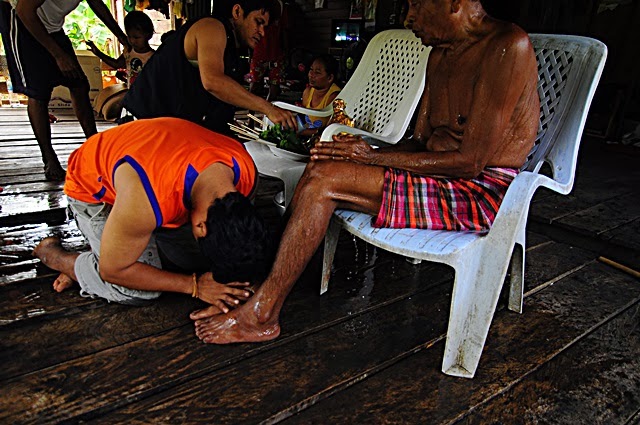 6.เริ่มกราบคุณพ่อก่อน ให้กราบ3ครั้ง<แบบมือได้>แล้วเอาเท้าคุณพ่อ แช่น้ำที่เตรียมไว้ แล้วค่อยๆล้างทีละข้าง